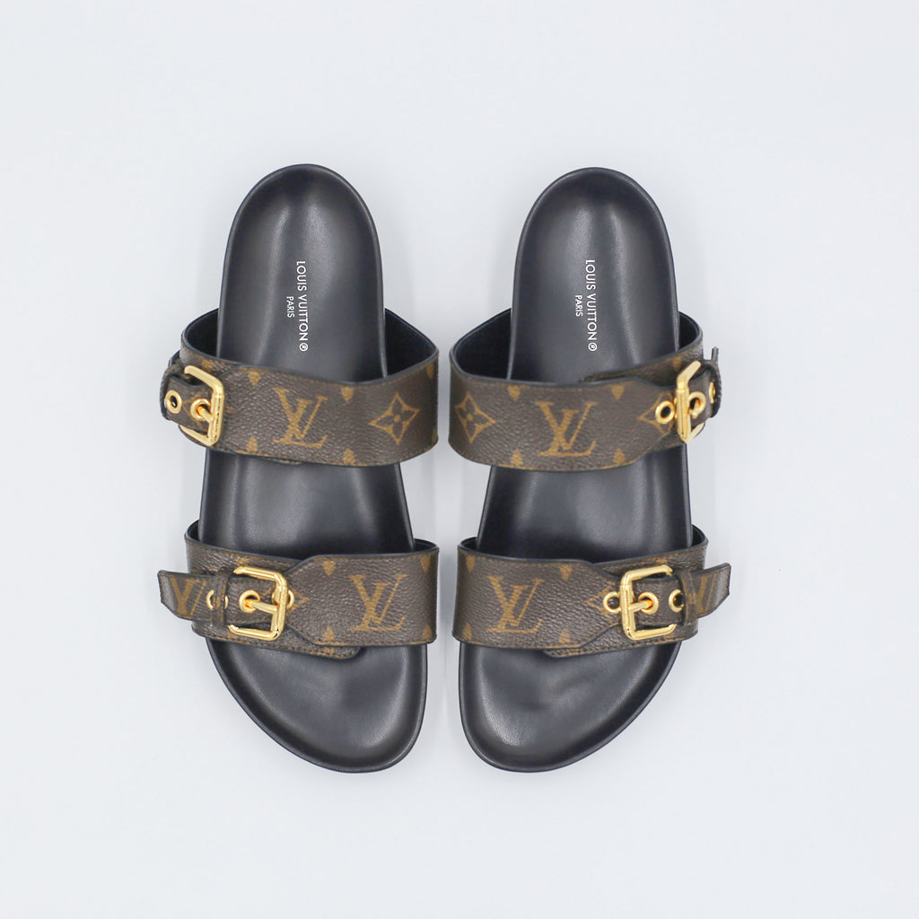 Upgrade your style with the authentic LOUIS VUITTON Monogram Bom Dia Mule Sandals, a chic blend of black leather and monogram toile canvas. These mules offer a mid-strap and an adjustable toe strap with a polished gold buckle, while their rubber sole ensures both style and comfort for everyday wear. Indulge in sophistication with every step.